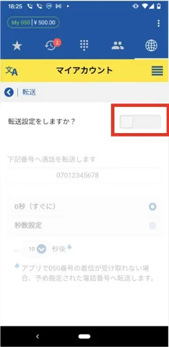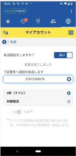 My050の電話転送は「転送機能」という名称です。 転送サービスの月額使用料は無料です。アプリ側で着信設定を追加するとすぐに利用できます。 転送のON/OFF設定はアプリからおこないます。
