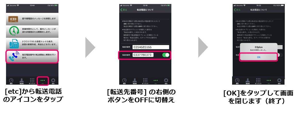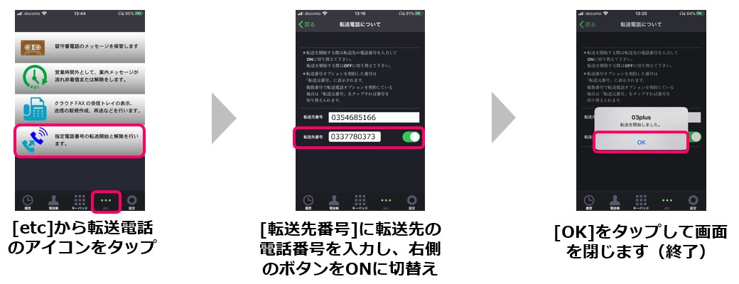 ※Webページ(お客様ページ)から転送設定をおこなう場合は、下記URLのご利用ガイドp.84「7.転送電話」をご覧ください。 https://03plus.net/pdf/03plus_guide.pdf