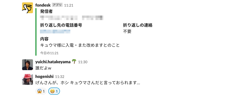 リモートのメンバーは、そもそも業務時間中でも100%電話は受けられないし、電話を切らないと折り返しもできないわけです。 ぜんぶの電話をSlackに私が書き起こして、メンバーに展開する必要があった。